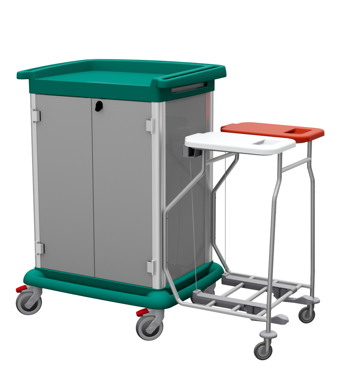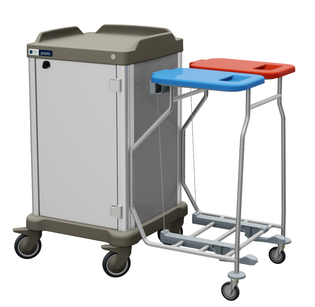 De vier niet markerende zwenkwielen met een diameter van 100 mm, zijn voorzien van kogellagers waarvan er twee geremd zijn. De wagens zijn in verschillende hoogtematen te leveren, namelijk 940 en 1100 mm. De breedte en diepte is 830 x 650 mm of 1270 x 570 mm.