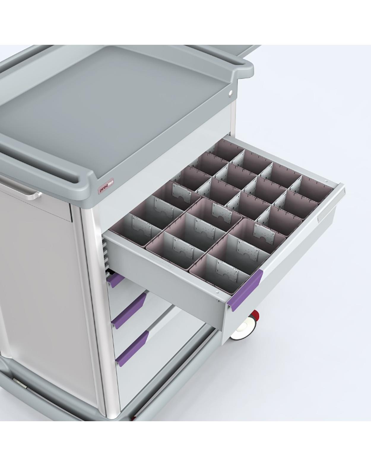 De Preciso-medicijnwagen is in de basis hetzelfde als de Preciso-verbandwagen. Ook deze multifunctionele wagen is voorzien van drie duwbeugels, een zijwaarts uitschuifbaar werkblad, ronde hoeken en stootranden. Beide wagens zijn uit te rusten met een telescopische geleiding of lades in een ISO-rasterwand. Deze lades zijn in vier verschillende hoogtes te verkrijgen: 76, 156, 256 en 316 millimeter. Daarnaast is het mogelijk om voor de lades een lang- en dwarsverdelers of kant-en-klare inzettrays met vakverdeling te verkrijgen. Het geheel is goed afsluitbaar met een centraal sleutelslotsysteem.