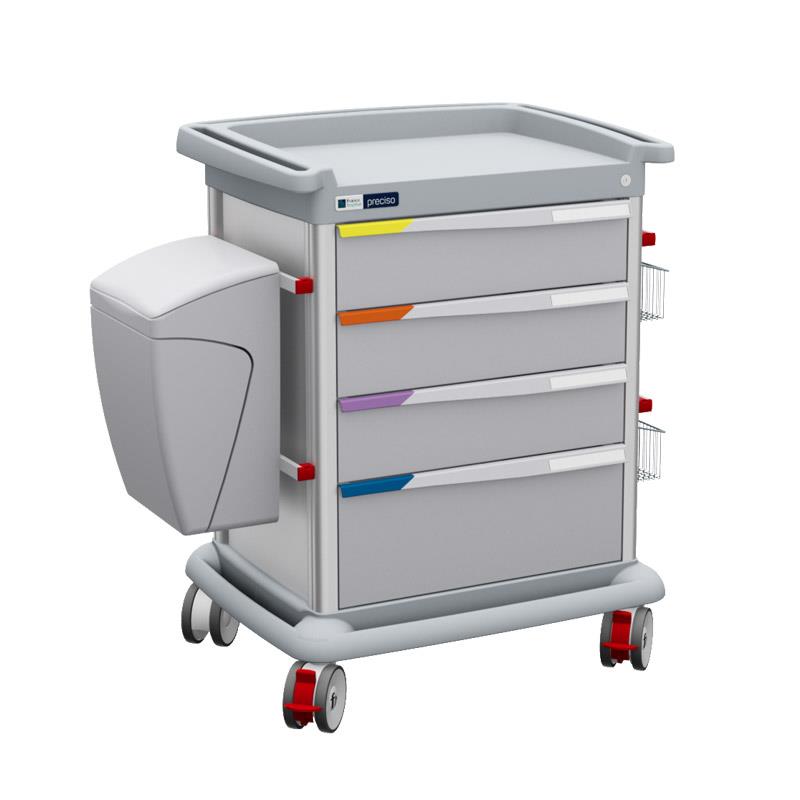 De Preciso verbandwagen is aan drie zijdes voorzien van duwbeugels met ronde hoeken en stootranden. Het brede werkvlak en de basis, inclusief bumper, maken deze wagen bijzonder geschikt voor medische toepassingen. De wagen is uit te rusten met lades met een telescopische geleiding of lades in een ISO-rasterwand. Deze lades zijn verkrijgbaar in vier verschillende hoogtes: 76, 156, 256 en 316 mm. Daarnaast is het mogelijk om in de lades met een langs- en dwarsverdeling te werken of kant en klare inzet trays met vakverdelingen toe te passen. De wagen is goed afsluitbaar door een centraal slotsysteem in standaard sleutelslotuitvoering of indien gewenst met een elektronisch (code)slotsysteem.