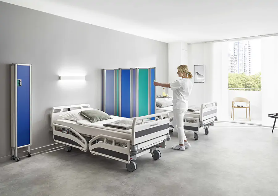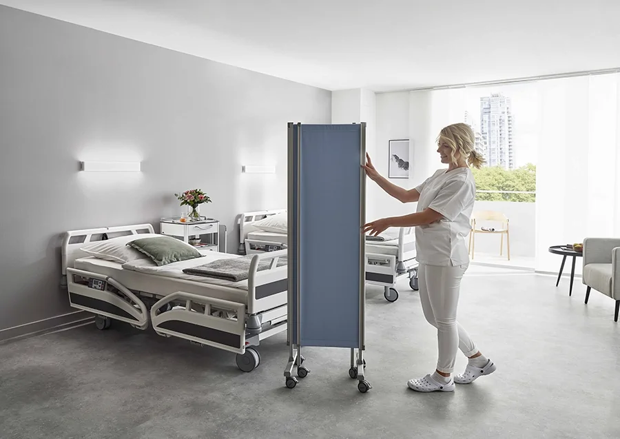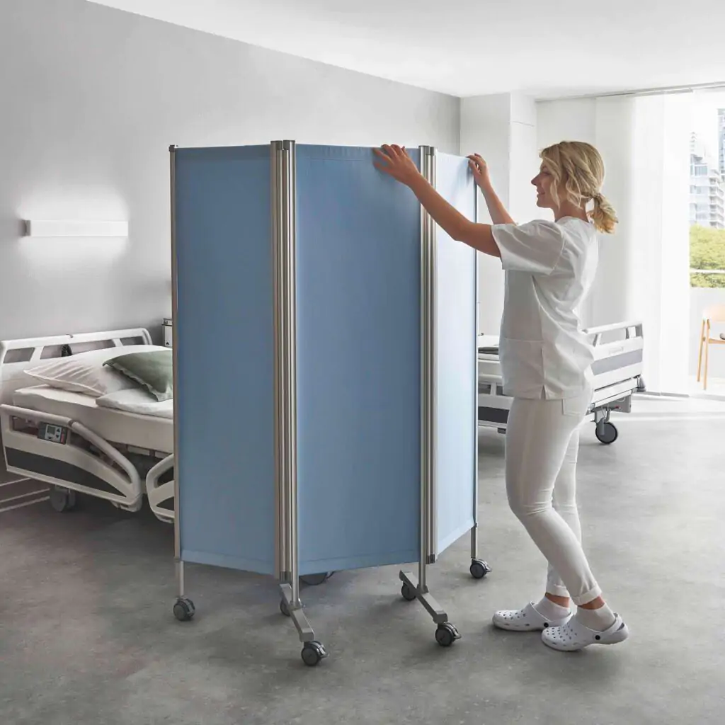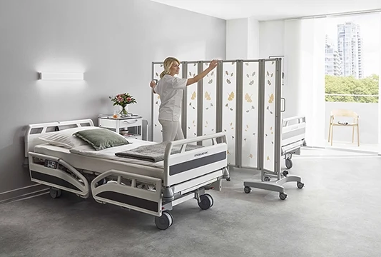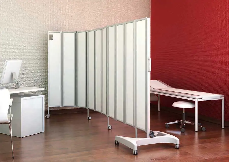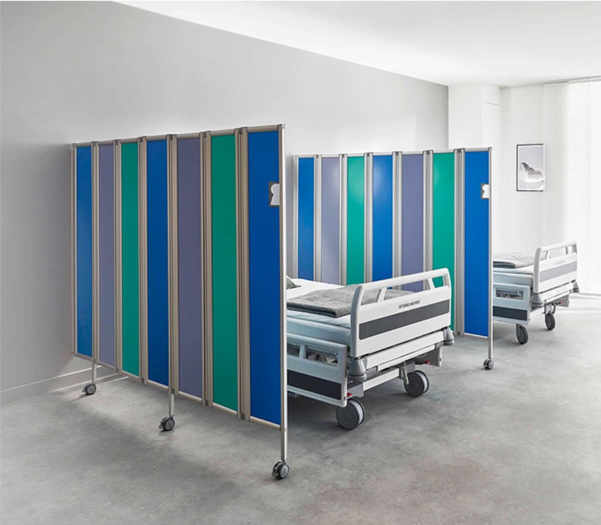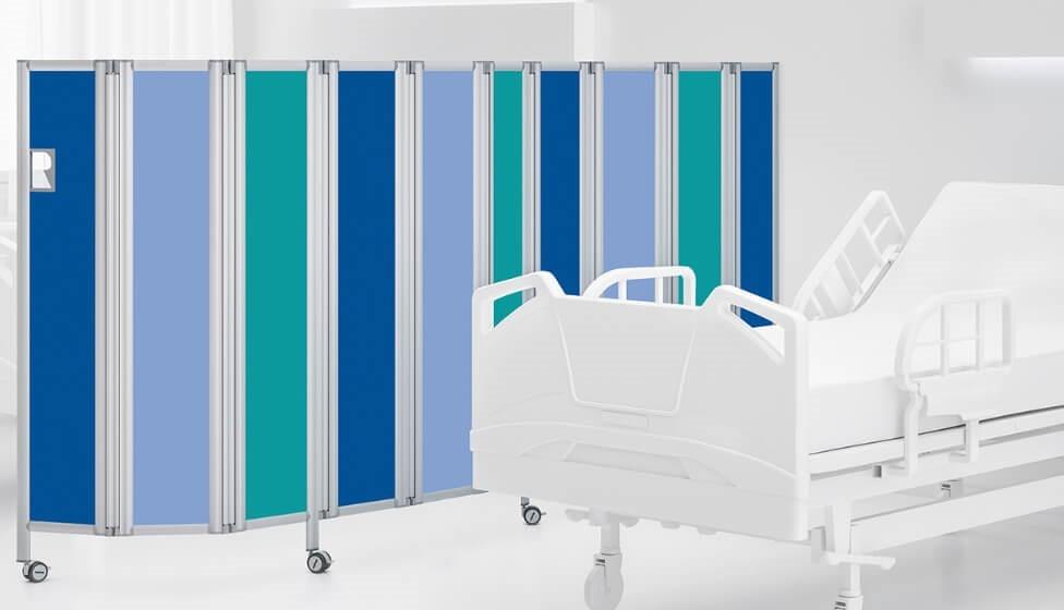 Mobiele vouwwanden, inzetbaar in elke ruimte, bieden de grootst mogelijke flexibiliteit in de dagelijkse zorg en behandeling.